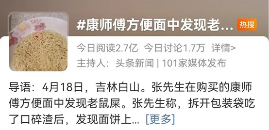 4月20日,某消费者拆开康师傅方便面并在面饼上发现疑似老鼠屎黑色颗粒物的视频在网上引发热议。