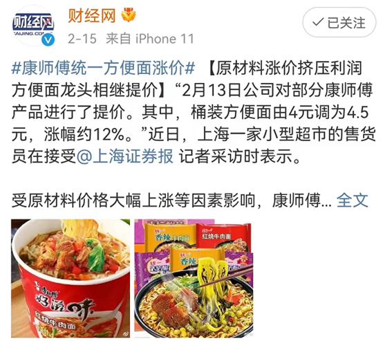 据了解,2021年三季度,康师傅对旗下20%的方便面品类产品进行了不同程度的提价。