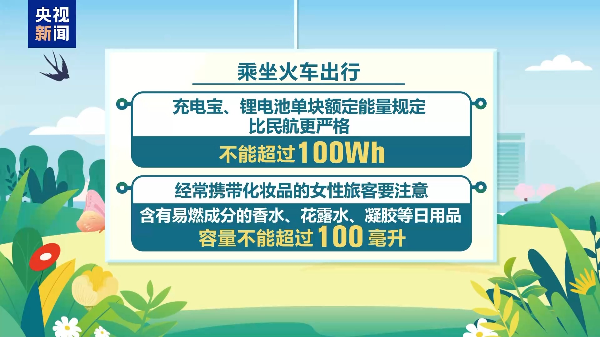 乘坐火车出行,充电宝、锂电池单块额定能量规定比民航更严格,不能超过100Wh。经常携带化妆品的女性旅客要注意,含有易燃成分的香水、花露水、凝胶等日用品,容量不能超过100毫升。